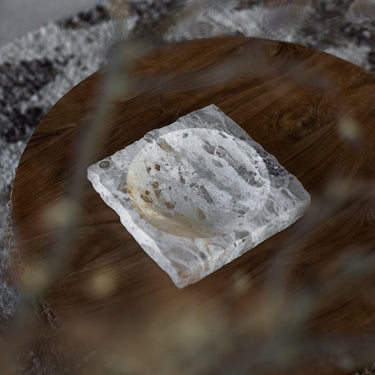Aya er en tung og rå marmorskål med ujævne kanter og et naturligt, upoleret udtryk. Den kvadratiske form giver skålen ro og tyngde, mens overfladen spiller smukt med lyset omkring sig.