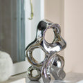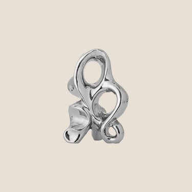 Vinini er en dekorativ skulptur i stentøj med en blank sølvoverflade, der fanger og spejler lyset i rummet. Den enkle, afrundede form giver et elegant og roligt udtryk – og gør sig smukt alene i vindueskarmen, på en skænk eller som kontrast til bløde tekstiler og træ. En lille detalje med stor virkning.