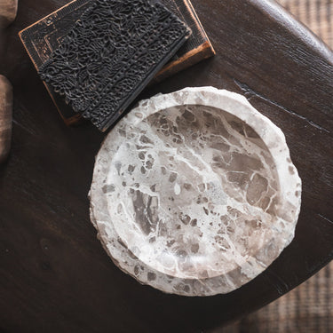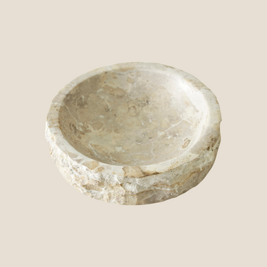 Wren er en dekorativ skål i rå marmor med et ærligt og upoleret udtryk. De ujævne kanter giver formen karakter, og materialets naturlige spil gør hver skål helt sin egen.