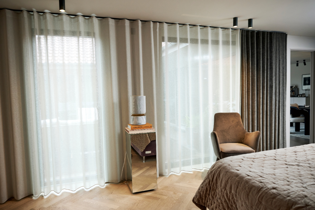 BLØD STEMNINGI en verden af stramme linjer og hårde flader er gardinet en blød kontrast. Det fanger lyset. Filtrerer nuancerne. Giver rummet en puls.