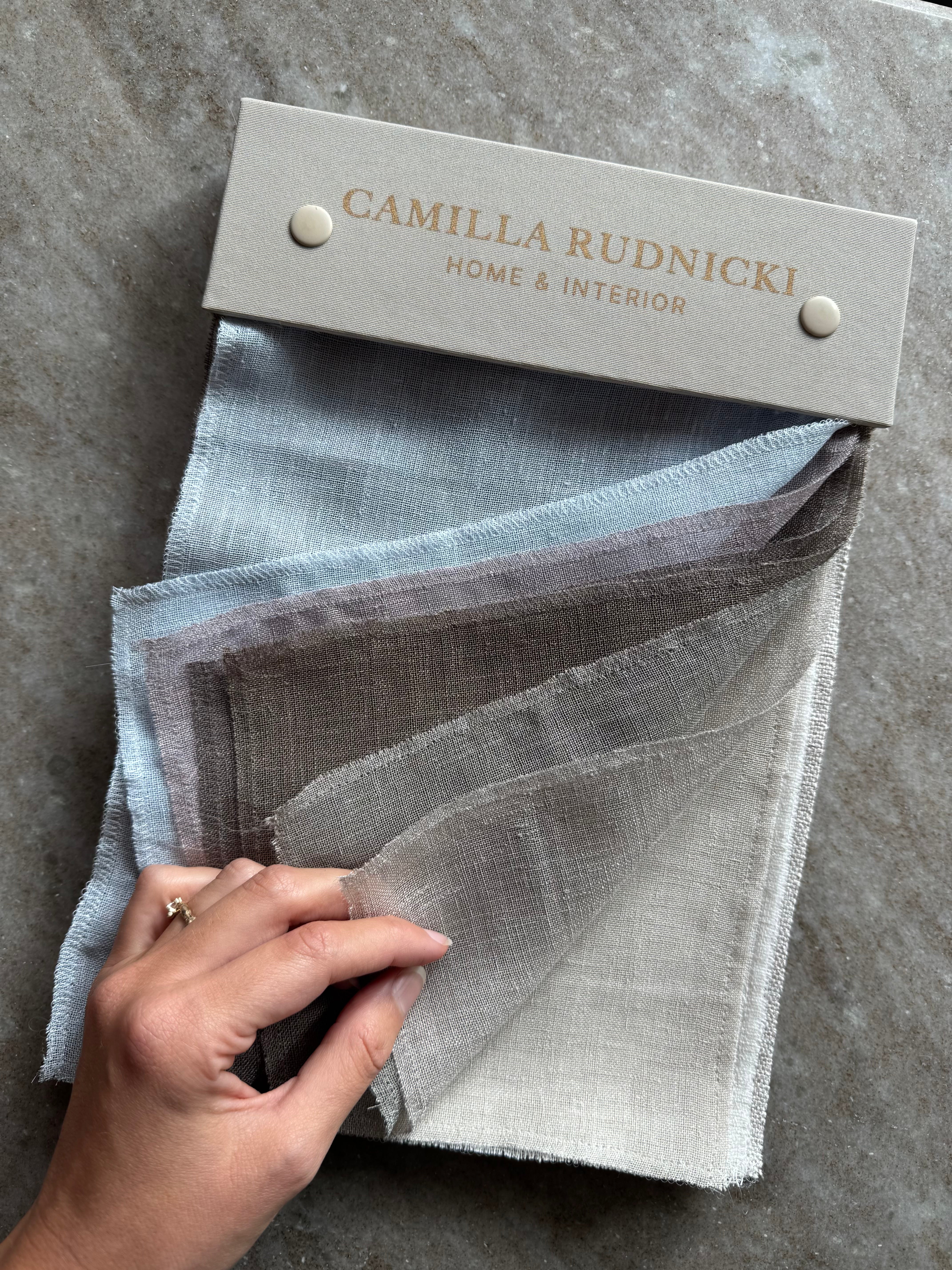 Derfor tilbyder vi en prøvepakke med alle vores gardinkvaliteter og -farver, så du kan mærke og se dem i dit eget hjem. Pakken koster 300 kr., og der medfølger en returlabel. Når du returnerer prøverne inden for 30 dage, refunderer vi det fulde beløb.