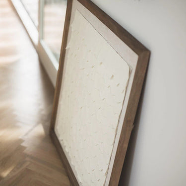 Talia er et moderne vægobjekt, hvor minimalisme møder håndværk. Det abstrakte relief i papir-maché skaber dybde og struktur, mens rammen i mangotræ tilføjer varme og naturlig balance.
